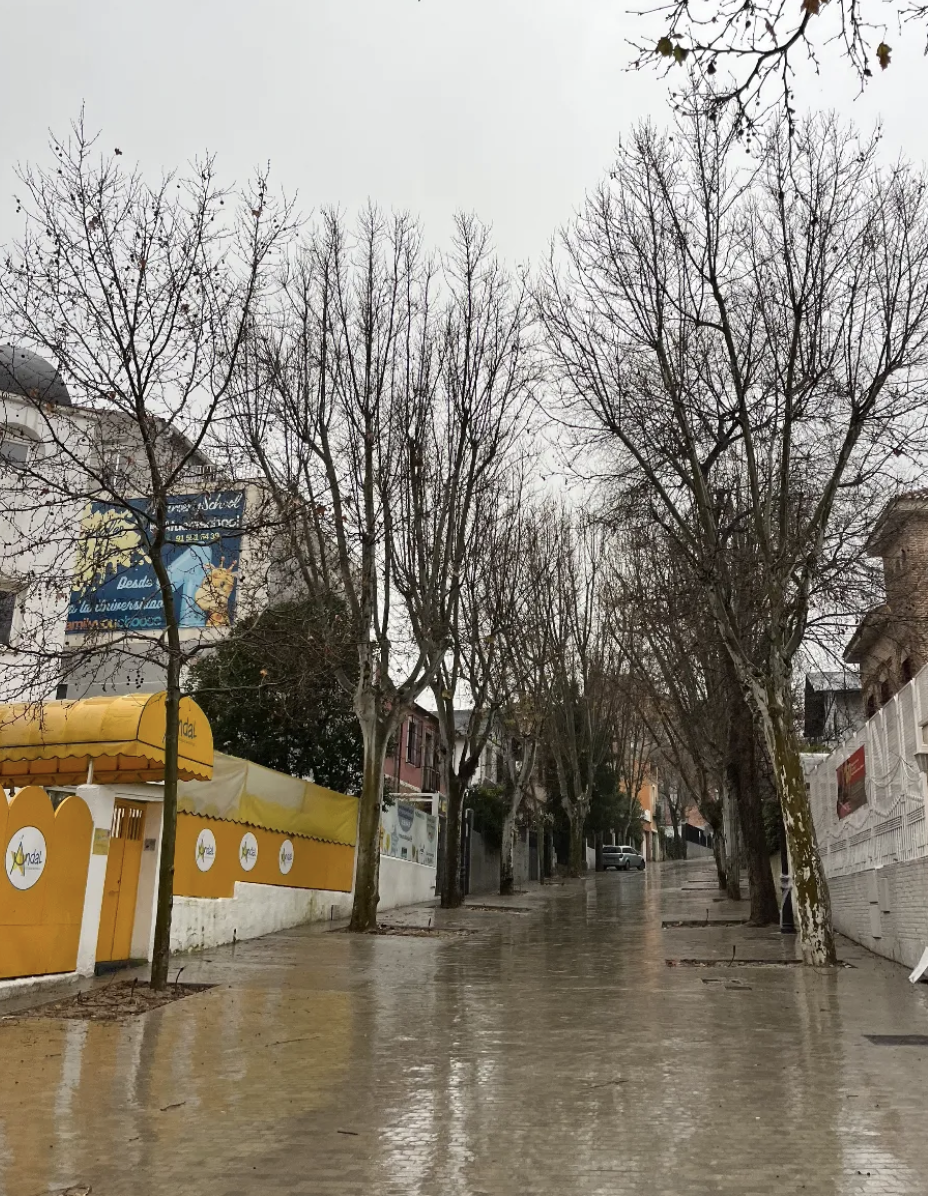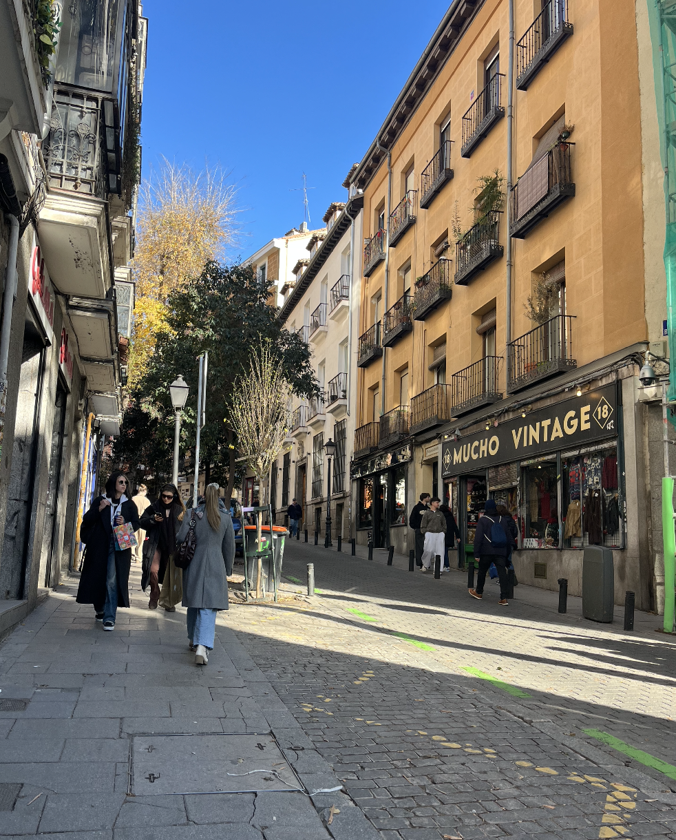 I have a lot of great memories near Tribunal. It’s the main stop for the neighborhood of Malasaña. My favorite café is at this stop. I’ve spent a lot of time wandering into the many overpriced vintage shops or getting lunch with friends around here. It’s one of the city’s older neighborhoods, so there's a lot of narrow streets, and terracotta roofs, and iron terraces. But there’s also a lot of street art. It’s a fun mix of old and new, ancient brick covered in graffiti tags and stickers promoting music sets. There’s just as much to do at night. Whenever my friends and I go out to bars, we usually meet up at Tribunal. There’s nothing like wandering around in the middle of the night with friends, the cobblestone streets glistening with yellow streetlight and neon signs from bars and the air saturated with second-hand smoke and laughter. Even if I’m not going out, sometimes I go come here just to take a quick walk by myself at like 10 or 11 before bed. It’s super lively at all hours of the day and night. And never feels unsafe or creepy. There’s always people hanging out in groups taking smoke breaks outside, and laughter, and teenagers lurking around in the main square. The vibes are unbeatable.